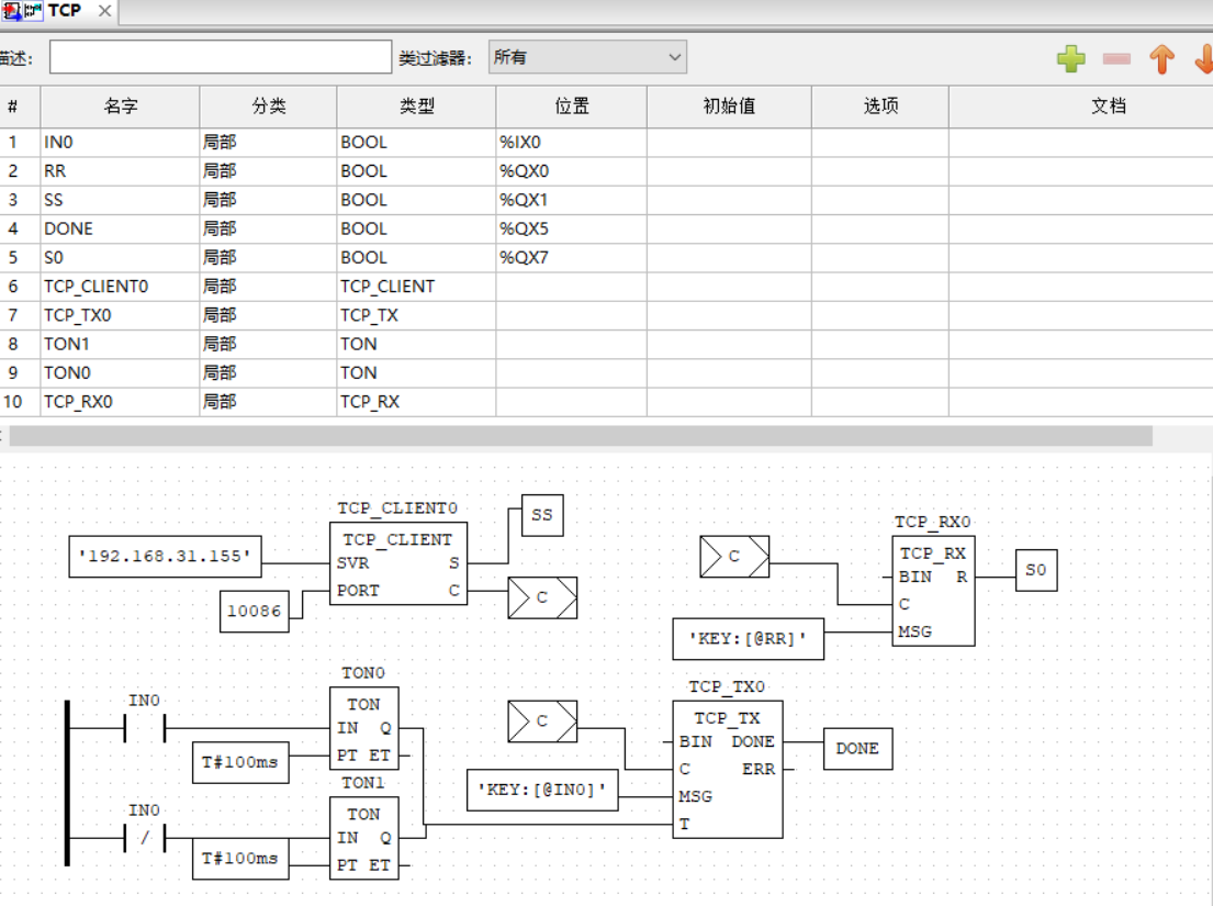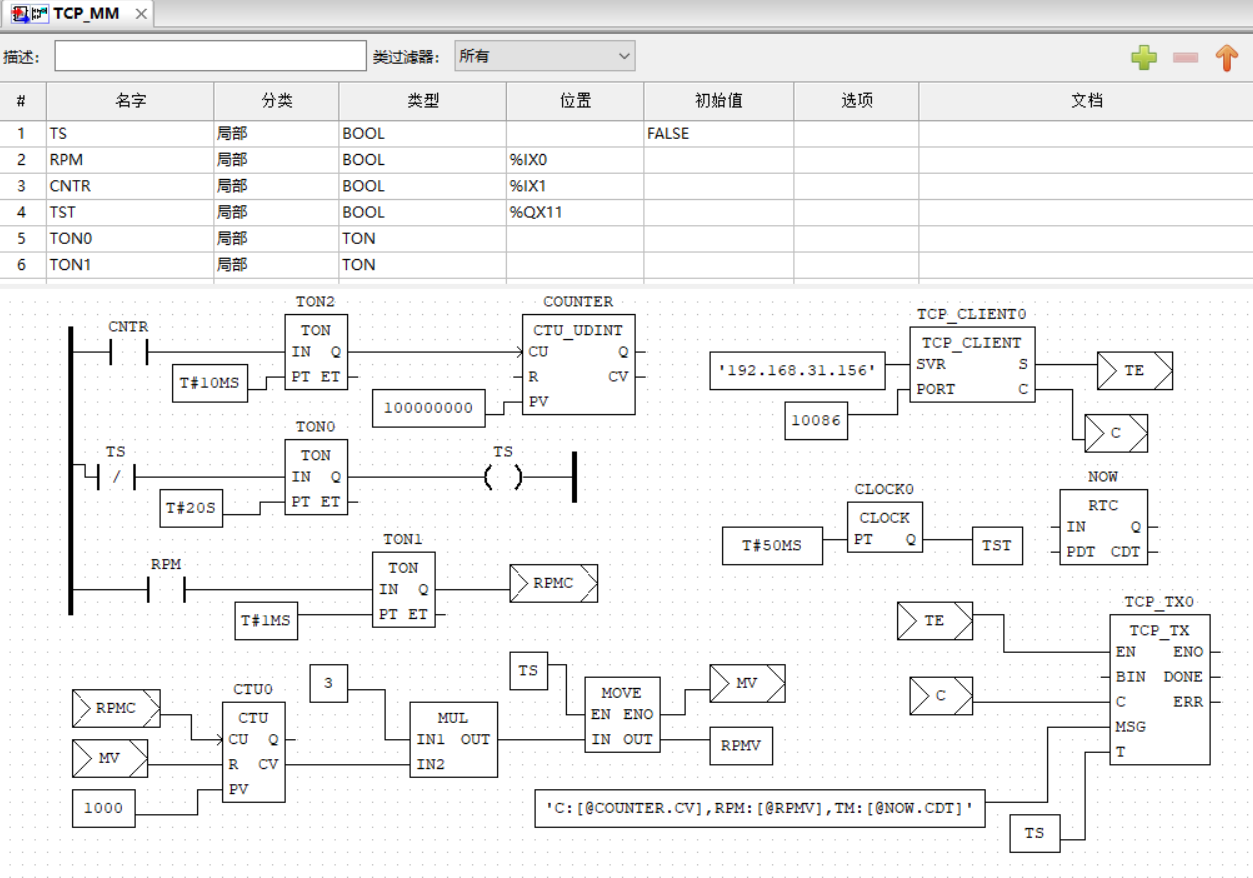 IO 回环实验是以一个输入端口 (%IX0) 作为触发信号和状态信息,触发设备通过TCP 向服务器发送输入信号的状态,同时接收解析TCP的接收消息,如果匹配则将信息状态更新到一个输出端口(%QX0),辅助的,用输出端口(%QX1)展现TCP_CLIENT 实例的连接状态,输出端口(%QX5)展现发送成功状态,以及输出端口(%QX7)展现解析成功的状态。