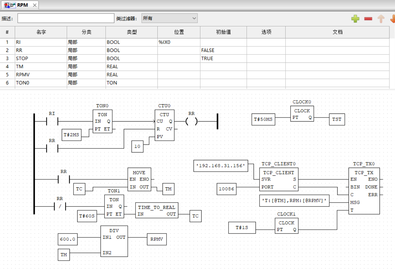本例演示用PLC-IOT 实现机联网(工业互联网)应用中常见需求:设备产量和运行速度的数据采集。产量采集实质是传感器检测一个单位的产品制造完成时发出一个脉冲信号,PLC-IOT对此脉冲进行防抖、累加计数,设备运行速度是在设备主电机加装传感器,主电机运行一周产生一个脉冲信号,PLC-IOT 统计 20 秒内的 脉冲数量 乘以 3 就折算出每分钟的电机转数 RPM,得到的数据通过TCP 端口 10086 发给IP地址为 192.168.31.156 的服务器。对于分布各地的设备数据采集,在设备端将当地的时间也发送给服务器,可以用数据完整表达:什么时间,设备是什么状态, 有利于做时间轴有关的统计应用,本例也演示了通过 RTC 功能块获取设备的本机时间,并用日期时间构造消息的方法。服务器端的调试窗口可以看到采集的数据,采样的偏差可能导致 3 的误差,速度数据更新的周期要20秒,如果设备的运行速度比较慢,这种方法比较适合。