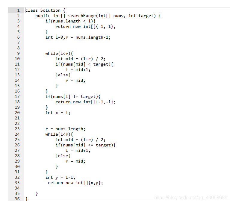 这道题是找出目标值在数组中出现的最初位置和最后出现的位置,我们同样可以用二分法,但是,稍微要有一点改变,也就是当你查询到该值时,不要停止,而是继续缩小范围,把你查到时的下标作为max,然后缩短,这样就能找到出现的最初位置了,而要搜索最后出现的位置就是这样的,当你查询到值等于目标值时,不要停止,而是缩小右侧范围,也就是min=mid+1,这里还有一个要注意的点是搜索最后出现的位置得到的值要进行减1操作,因为就算最后搜到了,他还是会进行min=mid+1,也就是现在的min并不是你想要的的结果,min-1才是。