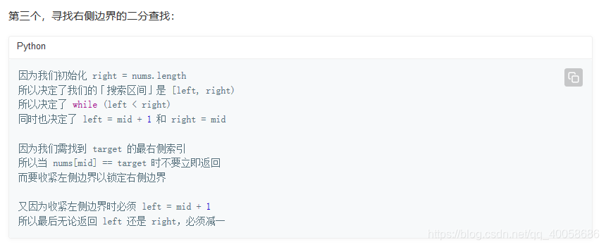 还是有一些细节会忘记,比如,这里当算右边的时候因为就算是最后一个元素和目标值相等,但是我还是向右边移动了一下,所以右边的最后结果需要对下标减1才是最右边的元素