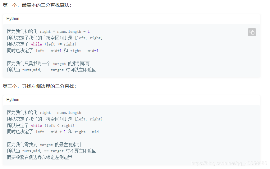 先来解决一下为什么有时候是max=len(num),有时候max=len(num)-1,和循环比较条件有时候是min<max,有时候是min<=max这个问题,这个问题解决了后面的就好办了,这其实是两组对应的。比如当你max=len(nums)-1时,你的循环条件就是min<=max,可以这样来思考。什么时候循环停止?循环结束时的状态是这样的:min=max+1,即[max+1,max],这样的区间是不存在的,为空,这个时候就该返回-1(也就是没有得到结果)。而当你的max=len(nums)时,循环结束的情况是这样的[max,max],而数组下标为max的话其实是越界的,那么我们就要在前一步停下来也就是max-1的时候就停下来。还有一个问题,为什么有时候max = mid,有时候max = mid+1的问题。