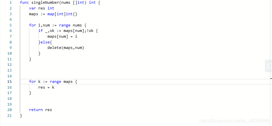 通过这个题我好像才第一次知道在golang中的map怎么删除其中的某个key-value,是这个方法delete(map,key)。至于题解中的那个异或方法我就不想去看了。。