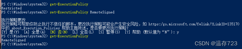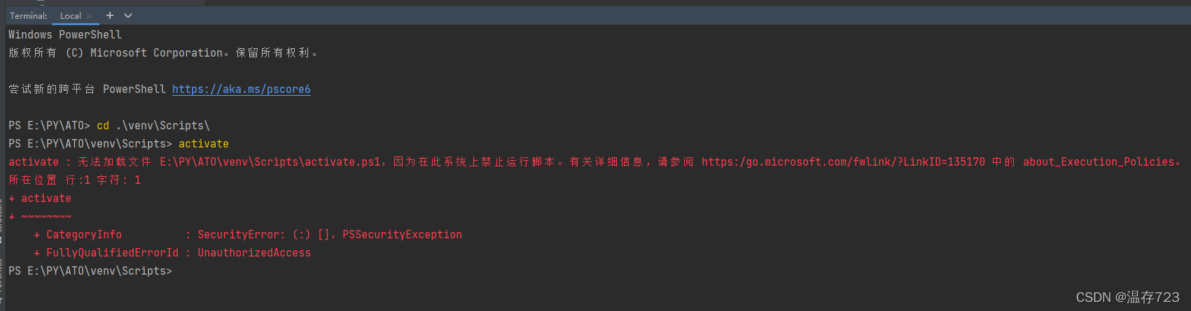 管理员运行PowerShell 执行set-ExecutionPolicy RemoteSigned再输入y回车:(解决vscode运行python时,提示无法加载文件xxx\.venv\Scripts\activate.ps1,未对文件进行数字签名,因为在此系统上禁止运行脚本。_ListenableFuture的博客-CSDN博客)
