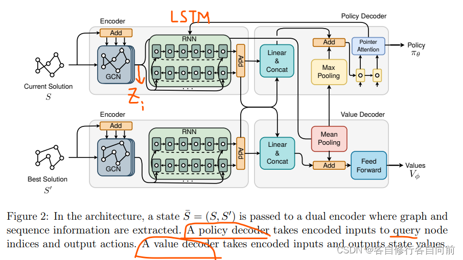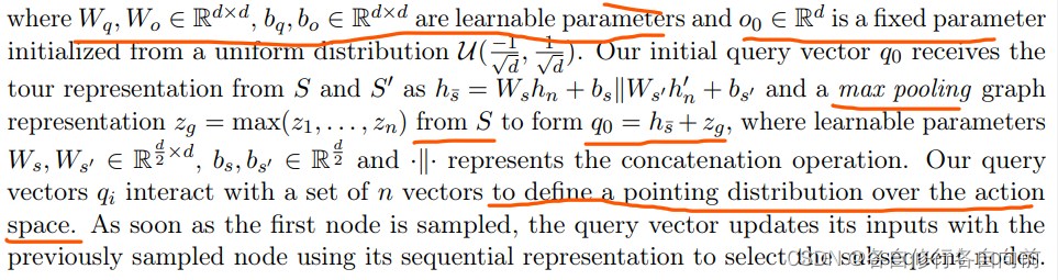 We use a pointing mechanism to predict a distribution over node outputs given encoded actions (nodes) and a state representation (query vector). Our pointing mechanism is parameterized by two learned attention matrices K ∈ R d×d and Q ∈ R and vector v ∈ R