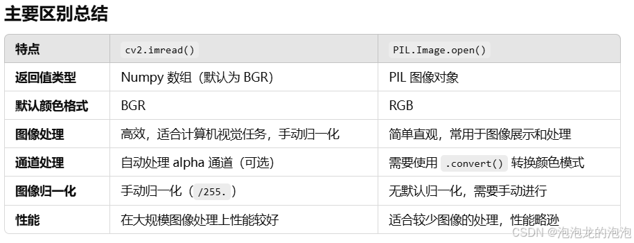 图片读取方式cv2.imread() 和 PIL.Image.open() 如果你需要处理大量图像并进行计算机视觉任务(如目标检测、图像分类等),推荐使用 cv2.imread(),因为它的性能更高,且能够更好地处理不同格式的图像。如果你需要进行图像加载和简单的图像处理(如格式转换、显示等),可以使用 PIL.Image.open(),因为它的 API 更加简洁。