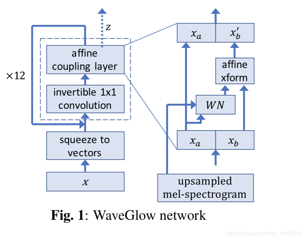 WaveGlow是一个生成模型,通过分布采样生成语音。为了确保网络是生成网络,我们从简单的分布取样。在这里,我们设定一个和我们想要的输出具有相同维度的零均值球形高斯,将这些samples输入一系列的层,将简单的分布转化成我们想要的分布。将audio sample在mel谱基础上建模。