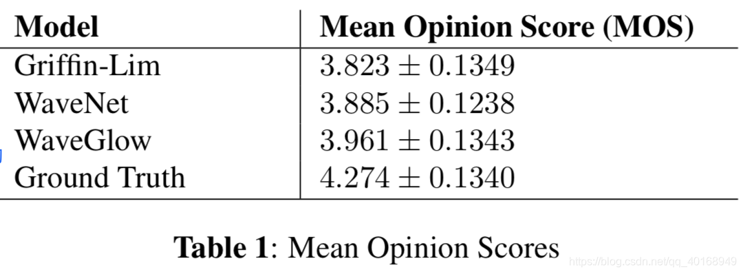 为了评估MOS,我们比较griffin-lim算法。Griff-Lim输入的是entire spectrogram而不是减少后的梅尔谱,重复的做时频转换以迭代的估计相位。我们的实验用60个iteration 。
