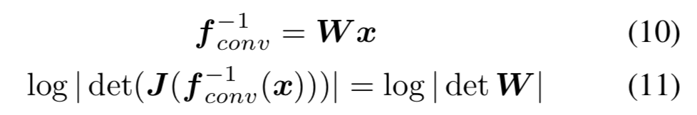 在对偶映射层中,同一半的通道不会相互修改,限制了通道上没有信息混合。Glow在对偶映射层之前加1*1的可逆卷积,实现通道的信息混合。这些卷积的W权重被初始化为正交,因此可逆(invertible)??why。因为变量的变化,变换的雅可比对数行列式加入损失函数,在训练时保证网络可逆。