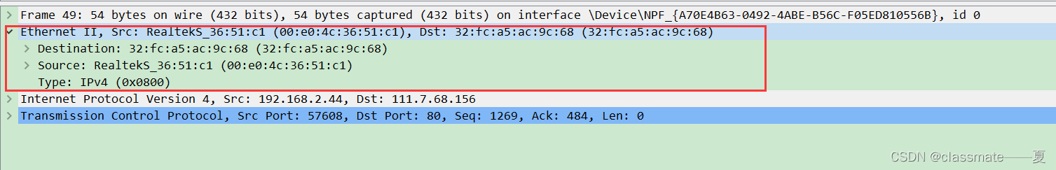 由上图我们可以看出,数据封装到底层的时候,已经封装了帧头(2层)、包头(3层)、段头(4层) ,由此,我们可以进行逆推。