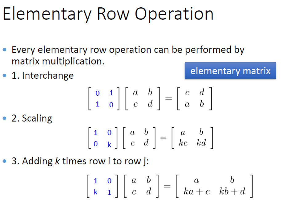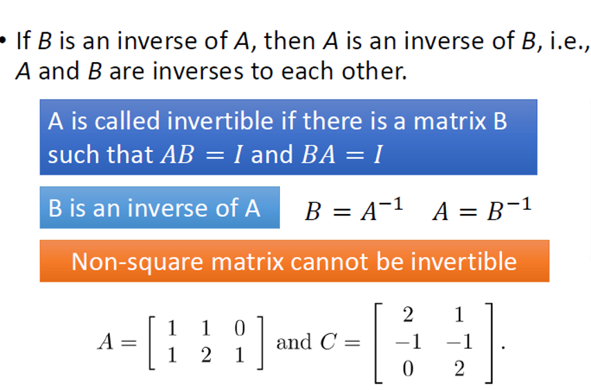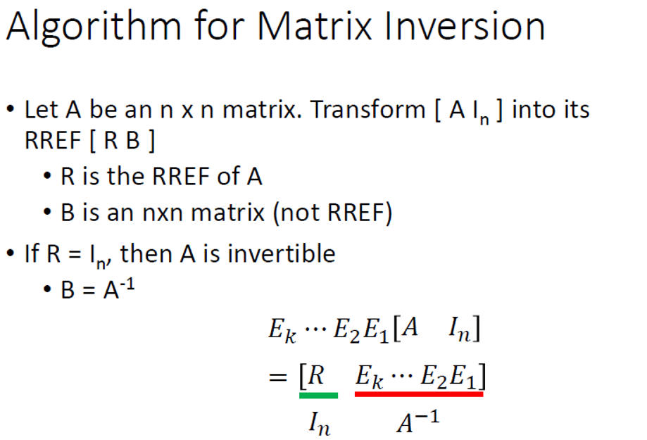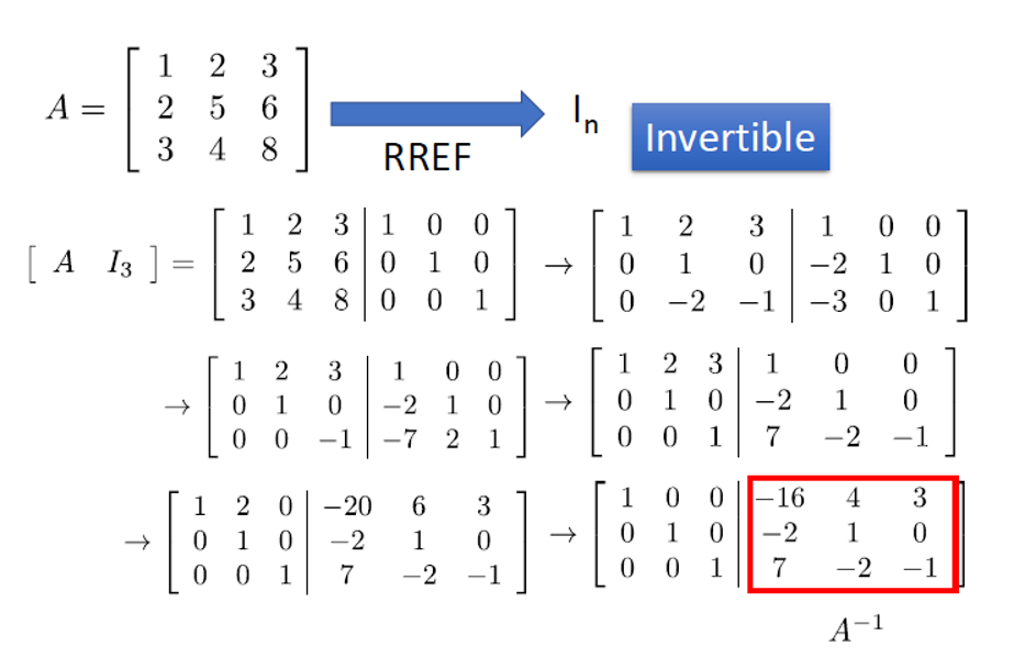 换言之,如果一个矩阵A是可逆的,当且仅当A的简化阶梯矩阵是单位矩阵