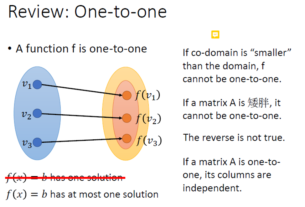 如果是矮胖型的矩阵,那么列之间肯定线性相关,那么对于某一个特定的 f(v) ,会存在两个不同的v1和v2,使得f(v1)=f(v),f(v2)=f(v),不满足单射(每个v射向不同的f(v)的条件