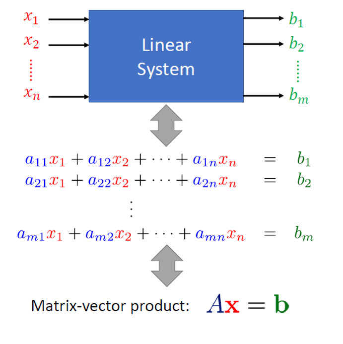 对于一个多元线性方程组如下图,输入为x=[x1 x2 x3...xn],经过一个线性变换后,输出为b=[b1 b2 x3...bm],这个线性系统便是对x做了一个线性的处理,其处理的方法为矩阵A