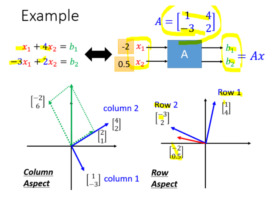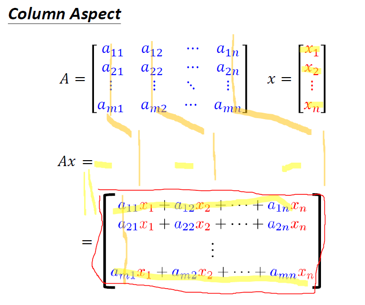 ‘对一个系数矩阵Am×n和一个代表参数的向量xn相乘,拿下图举例,有两种理解方式: