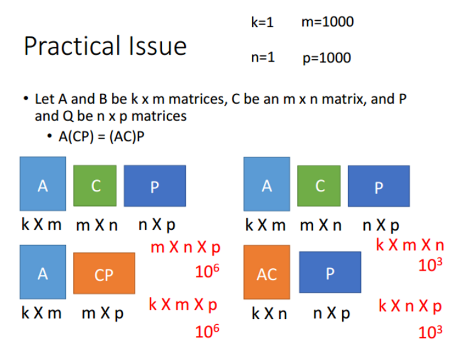 回到这个问题,如果是先CP,再A和乘积相乘,那么CP需要M*N*P次操作,10^6数量级;然后A在和结果相乘K*M*P,又是10^6数量级