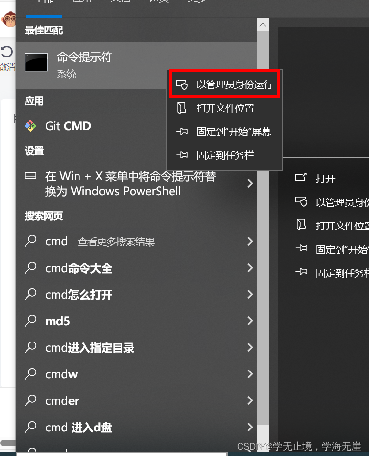 权限不足,可在搜索框搜索cmd,然后右击选择“以管理员身份运行”,再运行以上命令成功