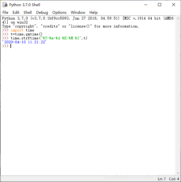 >>> time.strftime("%Y-%m-%d %H:%M:%S",t)