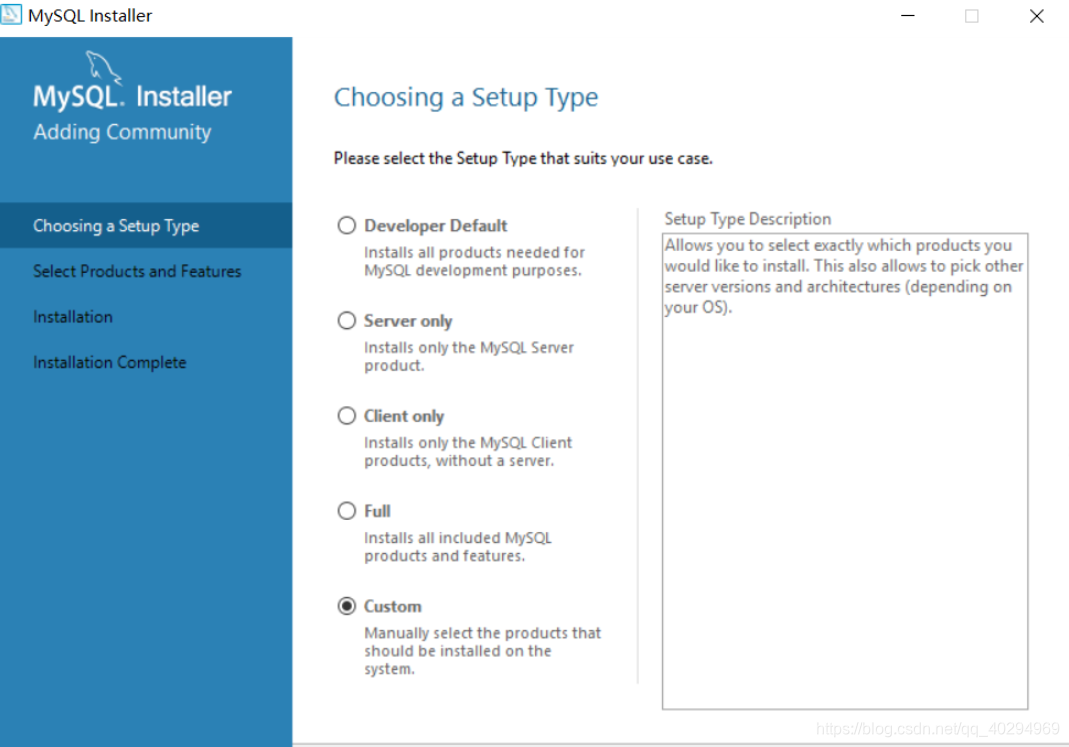 第一步:选择Custom,这里分为四个类型:a.默认配置方案。b.服务器。c.客户端。d.全功能。c.自定义