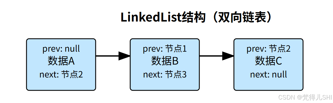 底层结构:基于双向链表实现,每个元素(节点)包含prev