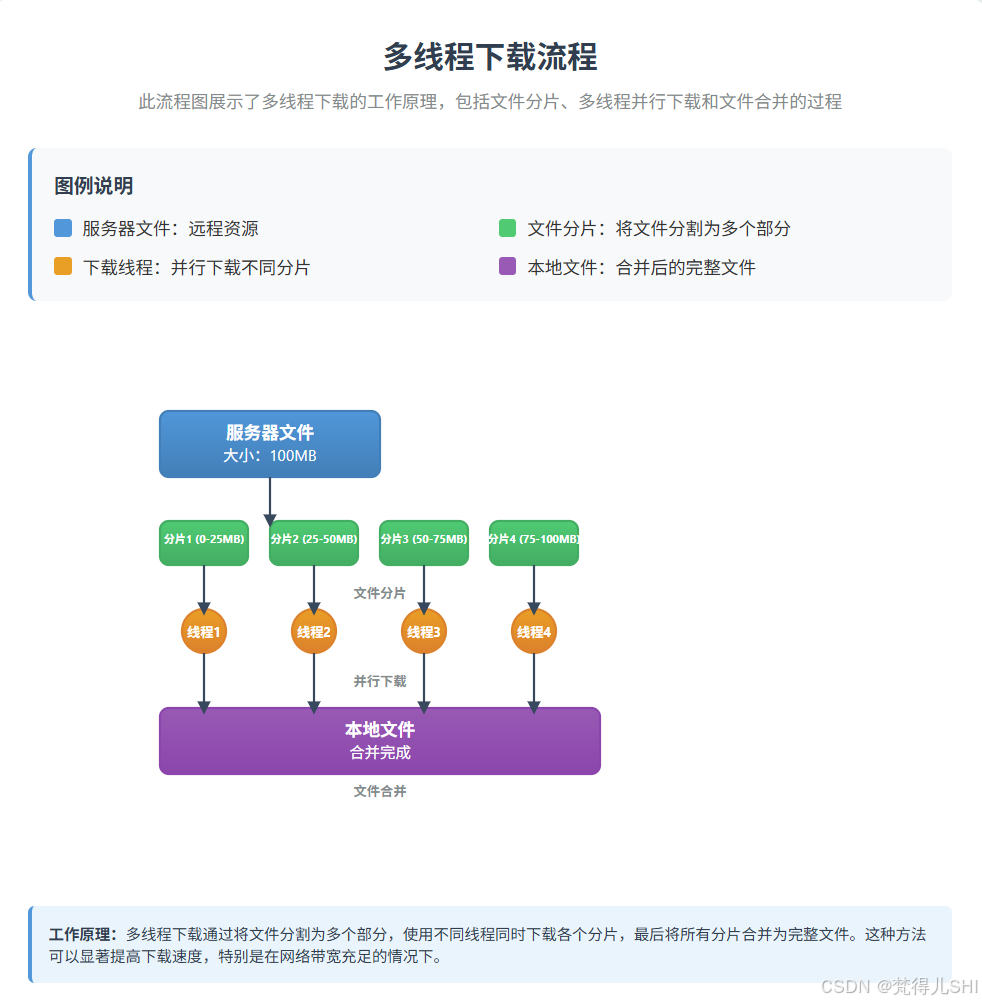 Range头指定起止位置)。 - 合并文件:所有分片下载完成后,按顺序将分片写入目标文件。