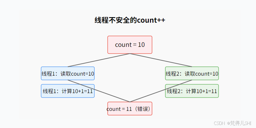 为什么会少算?因为count++不是原子操作。当两个线程同时读取到count=10,都 + 1 后写回,最终结果是 11 而不是 12,导致少算 1 次。