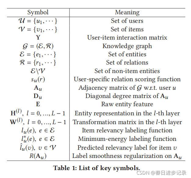 首先描述kg感知的推荐问题,并引入符号。在一个典型的推荐场景中,有一组用户U和一组项目v。用户-项交互矩阵Y是根据用户的隐式反馈来定义的,其中yuv=1表明用户u参与了项目v,如点击、观看或购买实体E集由项目V(V⊆E)和非项目E\V(例如对应于项目/产品属性的节点)组成。还有一个知识图G={(h,r,t)},其中h∈E、r∈R和t∈E分别表示知识三重体的头部、关系和尾部,E和R分别是知识图中的实体和关系集。给定用户-项目交互矩阵Y和知识图G,本文的任务是预测用户u是否对他/她以前没有参与过的项目v有潜在的兴趣。下表为本文的一些符合。