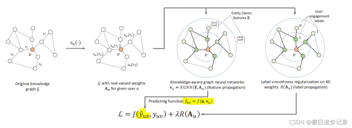值得注意的是,第一项可以看作是在KG上的特征传播,而第二项R(·)可以看作是在KG上的标签传播。对特定用户u,推荐器实际上是从项目特征到用户-项目交互标签的映射,即Fu:Ev→yuv,其中Ev是项目v的特征向量。因此,式子(8)利用Fu的特征和标签的KG的结构信息来捕获用户的高阶偏好。