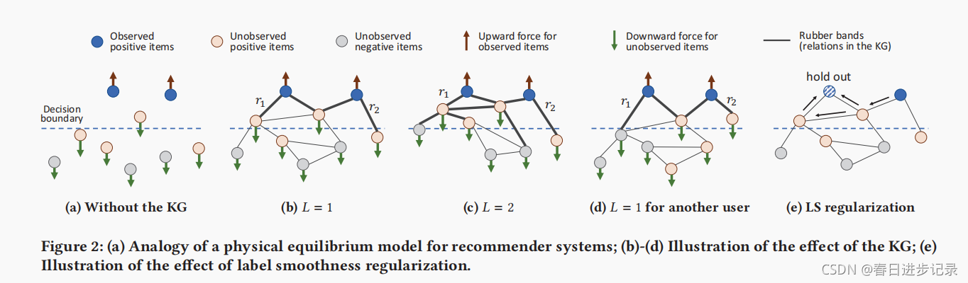每个实体/项目都被视为一个粒子,而受监督的正用户相关信号作为将观察到的正项目从决策边界向上拉上来的力,而负项目信号作为将未观察到的项目向下推下去的力。如果没有KG(图2a),这些项目只能通过协同过滤效果松散地连接(为了清晰起见,这里没有绘制)。相比之下,KG中的边缘可以作为对连接实体施加明确约束的橡皮带。当层数为L=1(图2b)时,每个实体的表示都是其自身和近邻的混合表示,因此,对正项的优化将同时将它们的近邻拉在一起。随着L的增加,KG的上升力更深(图2c),这有助于探索用户的高阶兴趣,并拉出更多积极的项目。值得注意的是,KG施加的接近约束是个性化的,因为橡皮带的强度(即Su(r))是特定用户和关系的:一个用户可能更喜欢关系r1(图2b),而另一个用户(具有相同的观察项目但不同的未观察项目)可能更喜欢关系r2(图2d)。尽管KG中的边缘施加了力,但边缘权重可能设置不适当,例如,太小,无法拉出未观察到的项目(即橡皮带太弱)。接下来,通过图2e展示了标签平滑度假设如何有助于正则化边缘权值的学习。假设在左上角保留了阳性样本,我们打算用其他的项目来重现它的标签。由于保留样本的真正相关性标签是1,右上角样本有最大的标签值,LS正则化R(A)将强制有箭头的边很大,这样标签可以尽可能地从蓝色“流”到条纹的。因此,这将收紧橡皮筋(用箭头表示),并鼓励模型在更大程度上拉出两个上粉色项目。