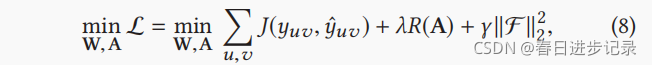 其中J是交叉熵损失函数。给定式7中的正则化,一个理想的边权值矩阵A应该再现每个保留项目的真实相关性标签,同时也满足相关性标签的平滑性.