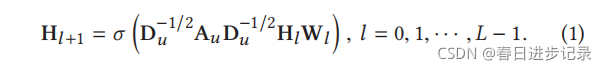 Hl是第l层中实体的隐藏表示矩阵,H0=E。Au是聚合相邻实体的表示向量。在本文中,设置了Au←Au+I,即向每个实体添加自连接,以确保在更新实体表示时考虑到实体本身的旧表示向量。Du是一个Au矩阵的度矩阵,是对角矩阵,因此,使用Du−1/2对Au进行归一化,保持实体表示矩阵Hl稳定。Wl∈Rdl×dl+1是一个层特定的可训练权值矩阵,σ是一个非线性激活函数,L是一个层数。