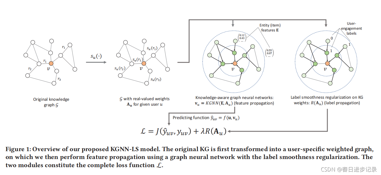 本文的方法与传统gnn之间的一个显著区别是,gnn图中的边权值没有作为输入。本文以有监督的方式训练的用户特定的关系评分函数来设置边权值。然而,增加的边权值的灵活性使得学习过程容易过拟合,因为关系评分函数的唯一监督信号来源来自用户-项交互(一般稀疏)。为了解决这个问题,本文开发了一种边缘权值正则化技术,从而导致更好的泛化。作者开发了一种基于标签平滑度的方法,该方法假设KG中的相邻实体很可能具有相似的用户相关性标签/分数。在上下文中,这种假设意味着用户倾向于与KG附近的项目有相似的偏好。作者证明了标签光滑性正则化等价于标签传播,并设计了一个用于标签传播的leave-one-out损失函数,为学习边缘评分函数提供额外的监督信号。作者表明,知识感知图神经网络和标签平滑性正则化可以在同一框架下统一,其中标签平滑性可以被视为知识感知图神经网络上正则化的自然选择。
