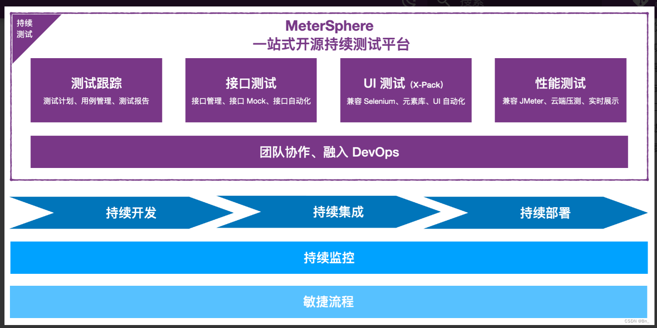 MeterSphere 是一站式开源持续测试平台,涵盖测试跟踪、接口测试、UI 测试和性能测试等,全面兼容 JMeter、Selenium 等主流开源标准,能够有效助力开发和测试团队在线共享协作,实现端到端的测试管理跟踪可视化、自动化测试、性能测试及融入持续交付 DevOps 体系,并充分利用云弹性进行高度可扩展的自动化测试,从而加速高质量的软件交付,推动中国测试行业整体效率的提升。