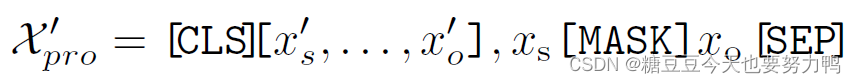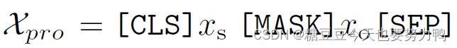 模板如下,[CLS]表示第一个单词,[SEP]是句子和句子之间的分隔词。xs是主语的类别,xo是宾语的类别,[mask]是给谓语类别留出来的slot。