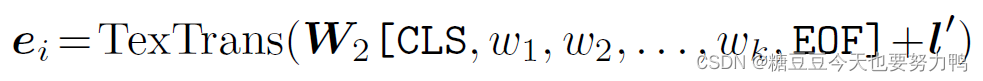 文本encoder也分为两个部分,先是embedding,再是文本Transformer,前面的embedding我觉得是下式的W2。下式的[w1,w2,…wk]是第i个caption的单词。l’是每个单词的位置embedding。[CLS]和[EOF]是可学习的特殊token,表示第一个单词和最后一个单词。ei是对第i个caption的编码结果。