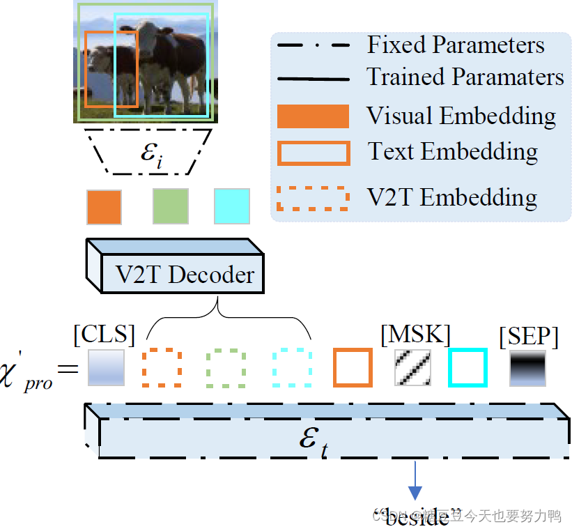 其中,xs’,…,xo’来自下图的V2T decoder。注意下图的εi/εt和预训练VRM那里的εi/εt是一个东西。