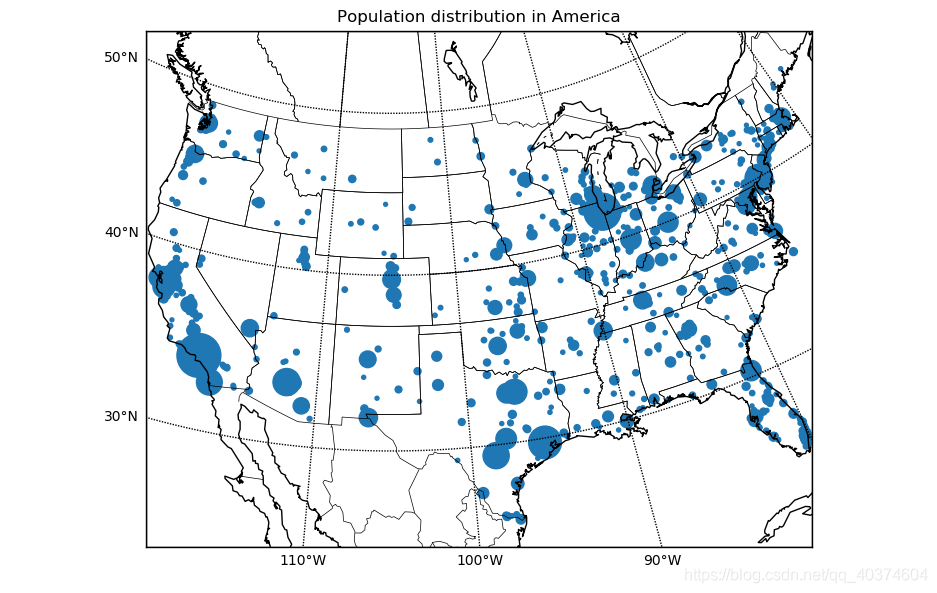 map.scatter(x,y,s=size) # 也可以使用Basemap的methord本身的scatter