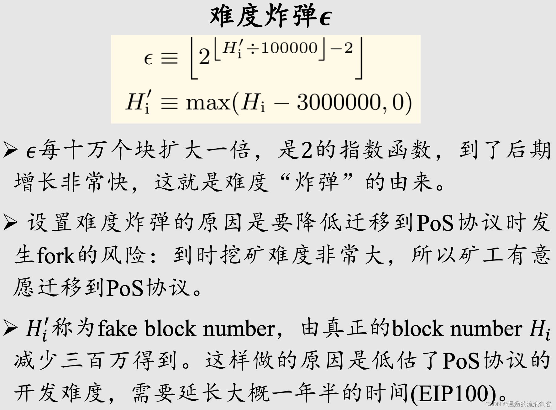 以太坊最后在一个EIP当中,决定计算难度炸弹地时候,要把区块号回退300万个区块来计算,就这个公式中,把真实的区块号减去三百万,算出 H i ′ H_i' Hi′,这个可以看成是假的区块号,然后算难度炸弹的时候是用这个假的区块号算的,这个给权益证明的上限争取了一些时间