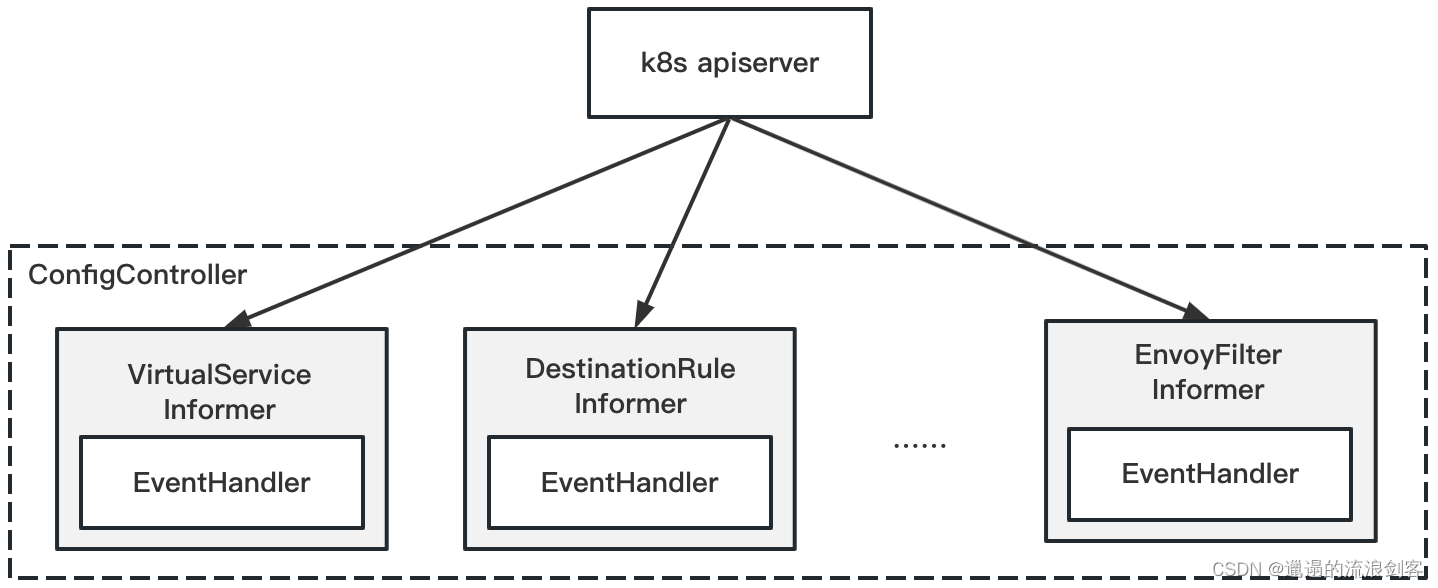 - 监听来自ConfigController的配置变化消息和ServiceController的服务变化消息,并将配置和服务变化内容通过xDS接口推送到Envoy