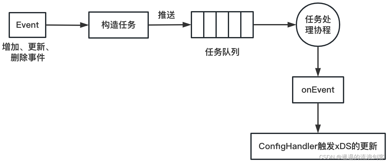 - 任务处理协程阻塞式地读取任务队列,执行任务,通过onEvent方法处理事件,并通过ConfigHandler触发xDS的更新
