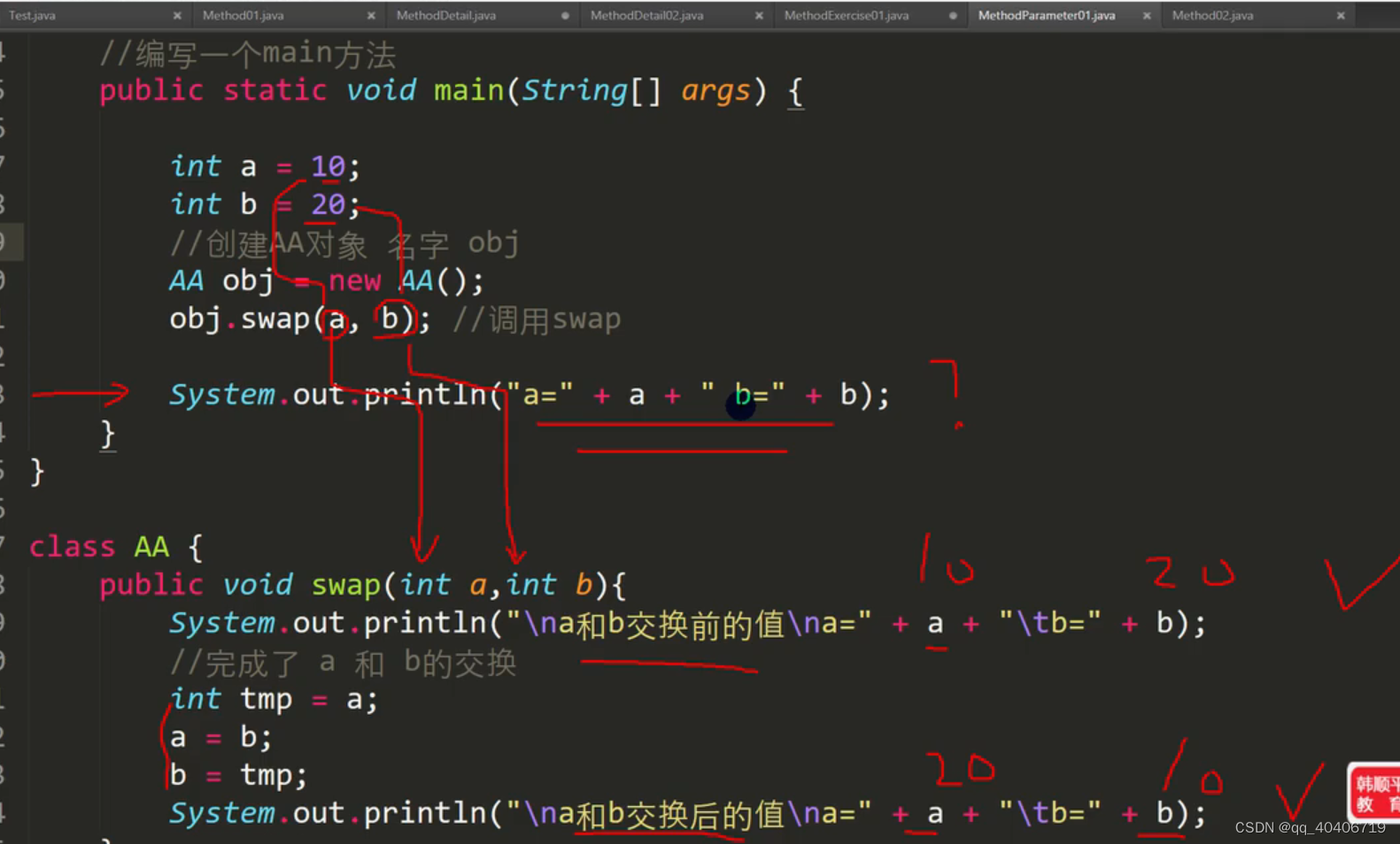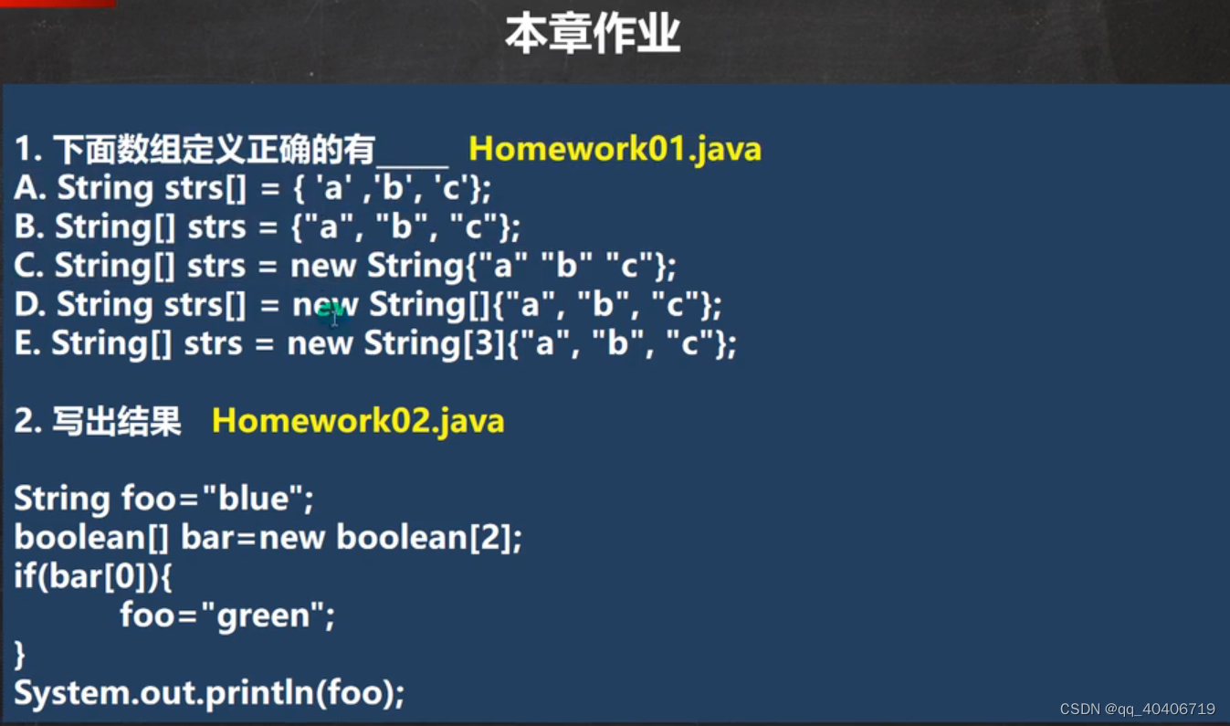 韩顺平JAVA-D20 1.B , C // 正确答案B , D2. if(bar[0])意思是bar[0]是正确的时候执行,因此输出的是blue3.break语句和while语句的配合4.6.地址拷贝7.