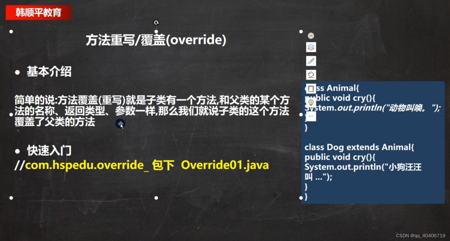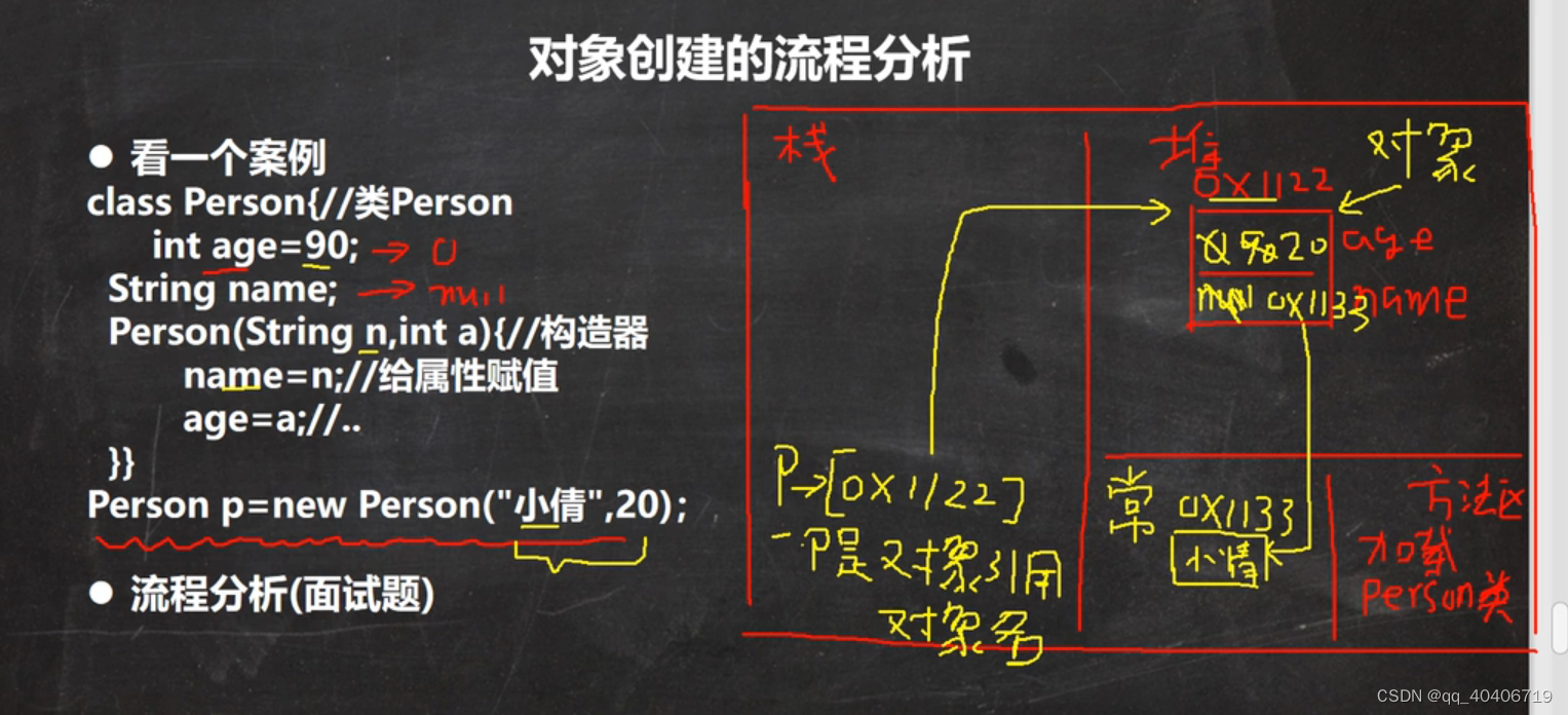 韩顺平JAVA-D26 当创建子类对象时, 不管使用子类的哪个构造器, 默认情况下总会去调用父类的无参构造器, 如果父类没有提供无参构造器, 则必须在子类的构造器中用 super 去指定使用父类的哪个构造器完成对父类的初始化工作。this("abc")调用B的有参构造器(有了this就不能有super了)默认super调用父类 A 的无参构造器,输出:a(隐藏了一个super)我的答案:a - a name - b - b name。1.new B()调用B类的无参构造器。hahah我是B类的有参构造器。我是C类的无参构造器。
