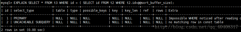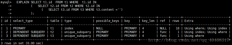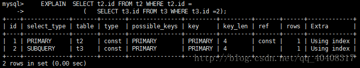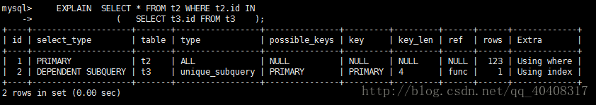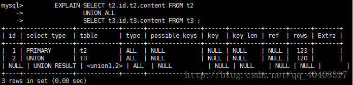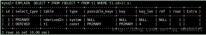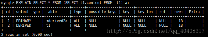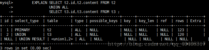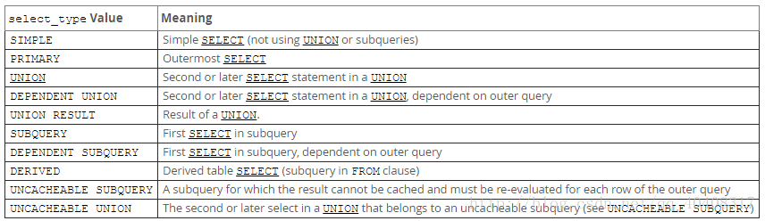 若第二个SELECT出现在UNION之后,则被标记为UNION;若UNION包含在FROM子句的子查询中,外层SELECT将被标记为:DERIVED