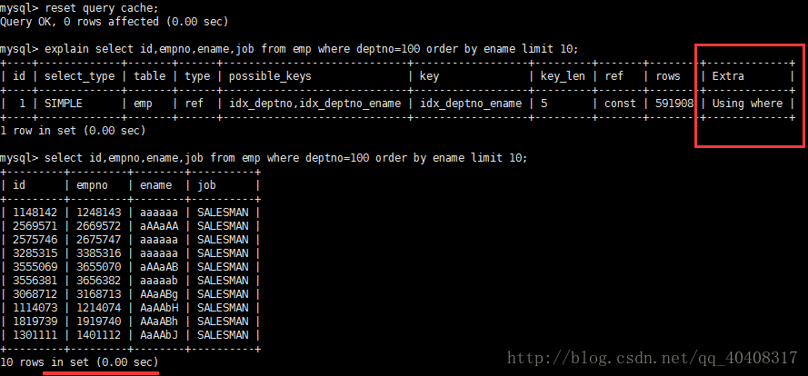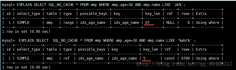EXPLAIN SELECT SQL_NO_CACHE * FROM emp WHERE emp.age=30 AND emp.name LIKE 'ab%';