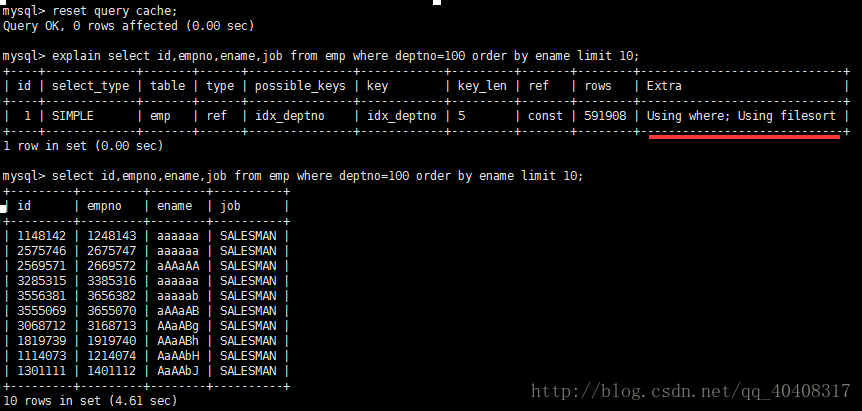 说明mysql会对数据使用一个外部的索引排序,而不是按照表内的索引顺序进行读取。出现filesort的情况:优化后,不再出现filesort的情况: