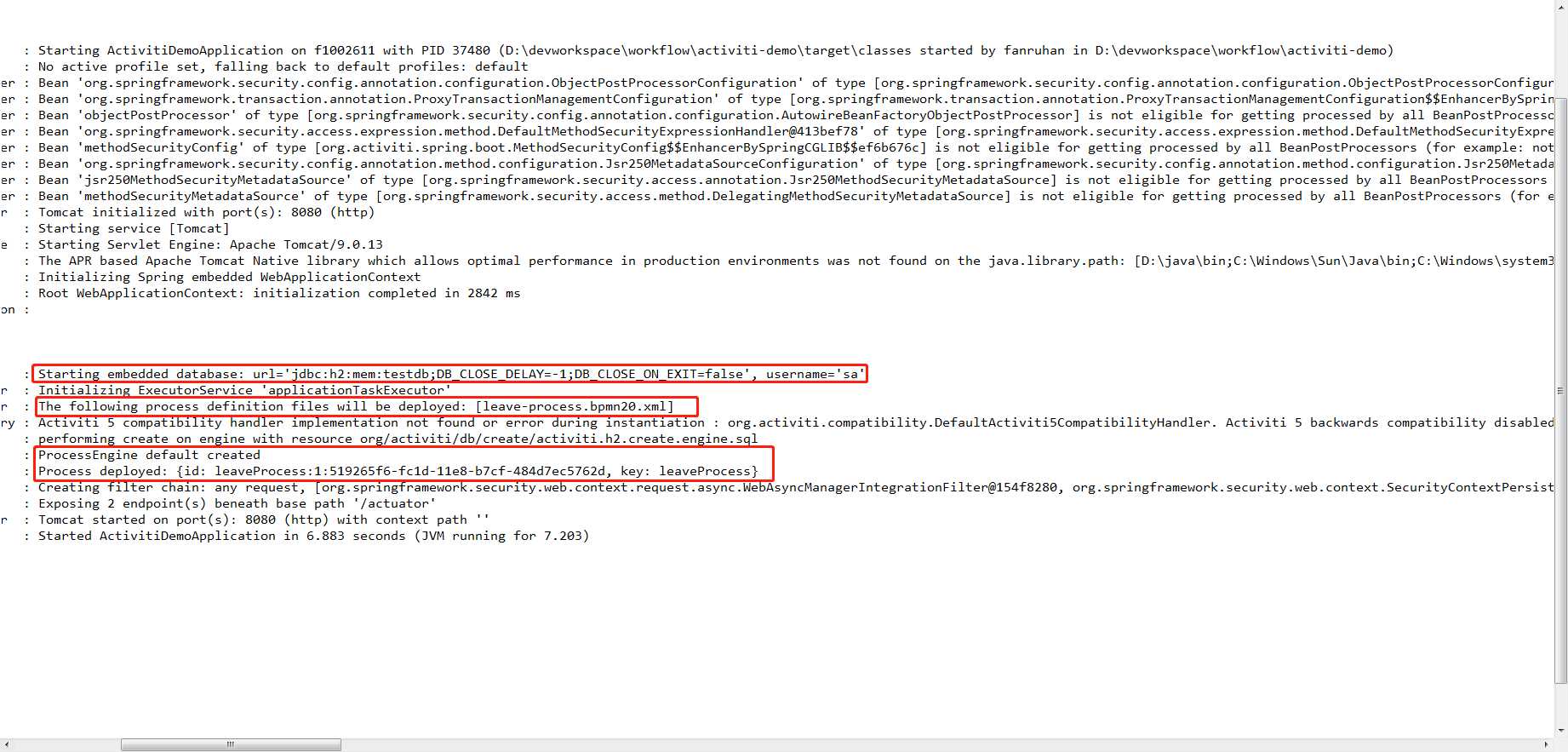 从日志中可以看出,流程引擎已经默认创建,并可以看到使用的默认数据源是H2的数据源,我们创建的流程也已经部署。