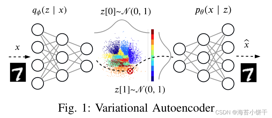 从图中可以看到,VAE将数据点映射为一个二维平面的圆形,颜色相近的聚集在一起,从这样的子空间中采样新点,生成新图像,就可以让新图像看起来与原真实图像更相似。