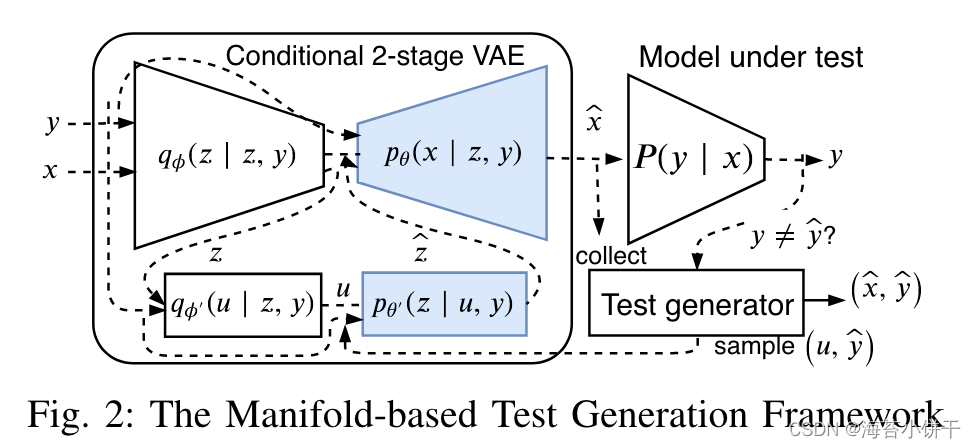 基于假设:变分自动编码器(CVAE)的变体捕获数据集的分布域模型,从该流形中采样新的测试用例,使用解码器将其映射到输入维度,得到更有可能是遵循真实分布的测试输入。