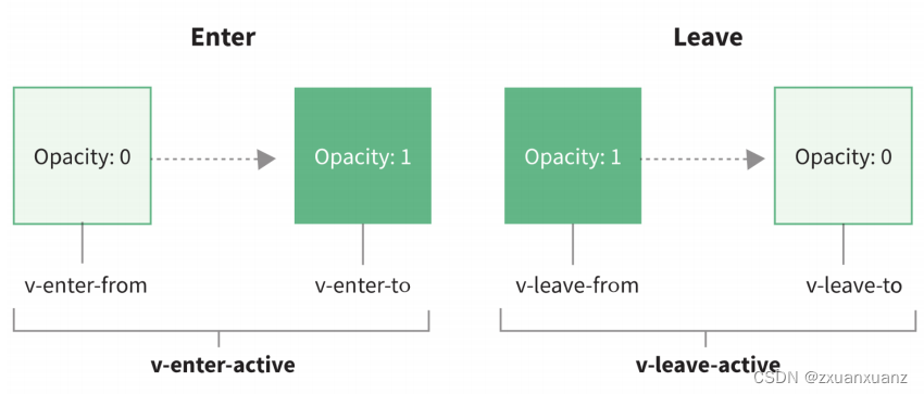 标签在进入和离开的时候,会有 fade-enter-active 和 fade-leave-active 的 class,进入的开始和结束会有 fade-enter-from 和 face-enter-to 两个 class。