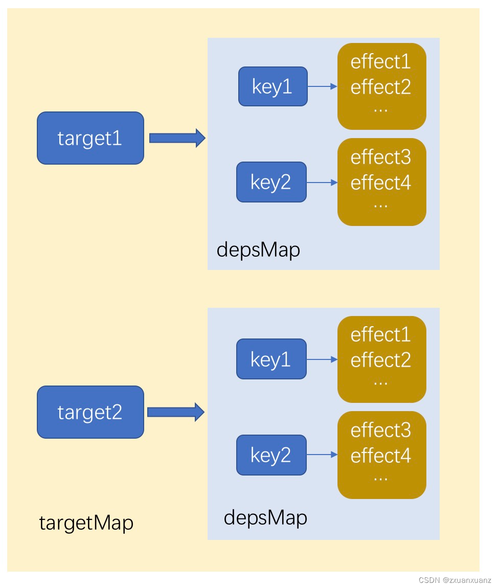 外部创建了全局的 targetMap 作为原始数据对象的 Map,它的键是 target,值是 depsMap,作为依赖的 Map;这个 depsMap 的键是 target 的 key,值是 dep 集合,dep 集合中存储的是依赖的副作用函数。
