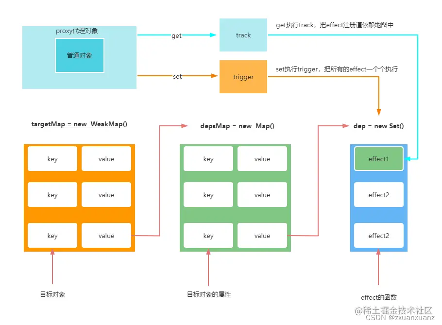 4、track 函数外部创建了全局的 targetMap 作为原始数据对象的 Map,它的键是 target,值是 depsMap,作为依赖的 Map;这个 depsMap 的键是 target 的 key,值是 dep 集合,dep 集合中存储的是依赖的副作用函数。为了方便理解,可以通过下图表示它们之间的关系: