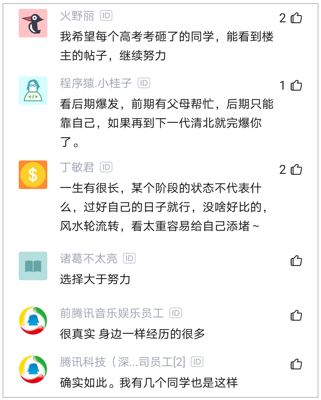不过,也有网友认为,楼主这个帖子对大家有指导意义,表示,每个人的好运不用,清华的人好运是智商高,楼主的好运是家庭好,大家都在努力把生活过好,楼主二本去cmu,刷进google,在同学里也是绝无仅有的,肯定也很努力。